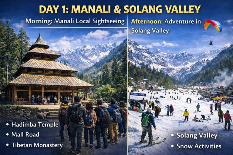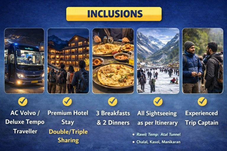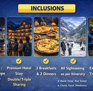 This tour includes Manali sightseeing, Solang Valley, Atal Tunnel, Rohtang Pass snow experience, Kasol cafes, Chalal Village trek, and Manikaran Sahib—making it ideal for friends, couples, solo travelers, and budget explorers.